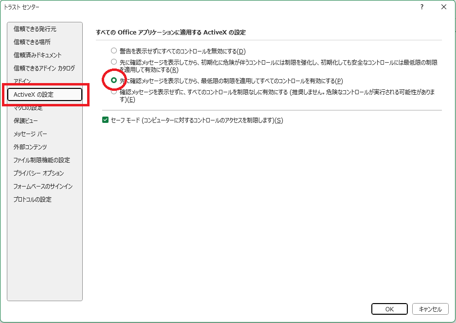 - 「トラストセンター」画面の [ActiveX の設定] をクリックします。