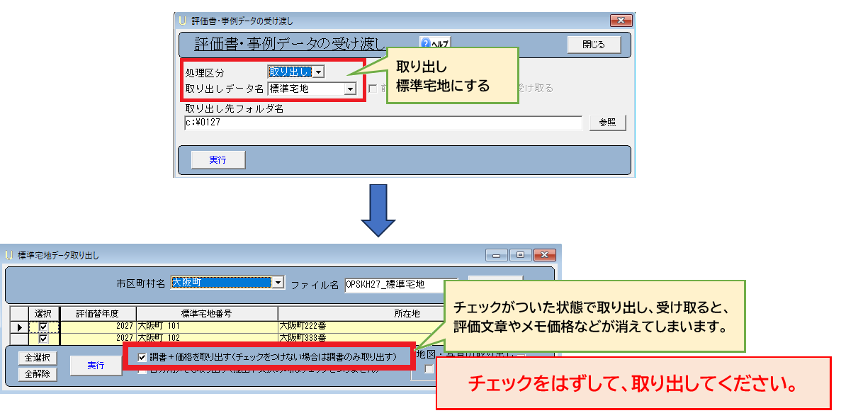 • 障害の状況:取り出した標準宅地調書のデータを上書きで受け取ると、以下のデータが消えてしまう。