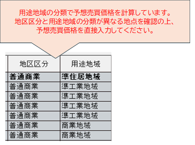 地区区分と用途地域の分類が異なる地点は予想売買価格を直接入力してください。※入力モードは「通常入力」にします。