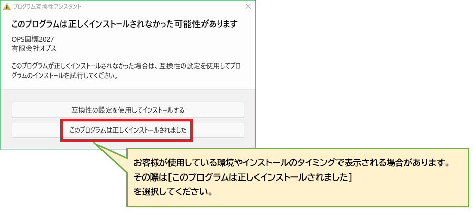インストールが完了したあと、下記の「プログラム互換性アシスタント」が表示される場合があります。その場合は[このプログラムは正しくインストールされました]を選択してください。